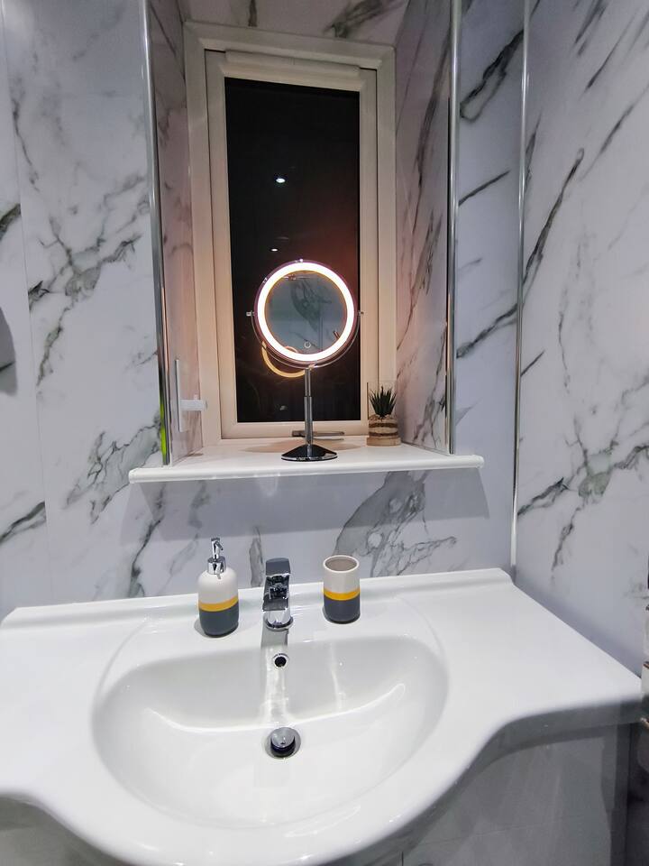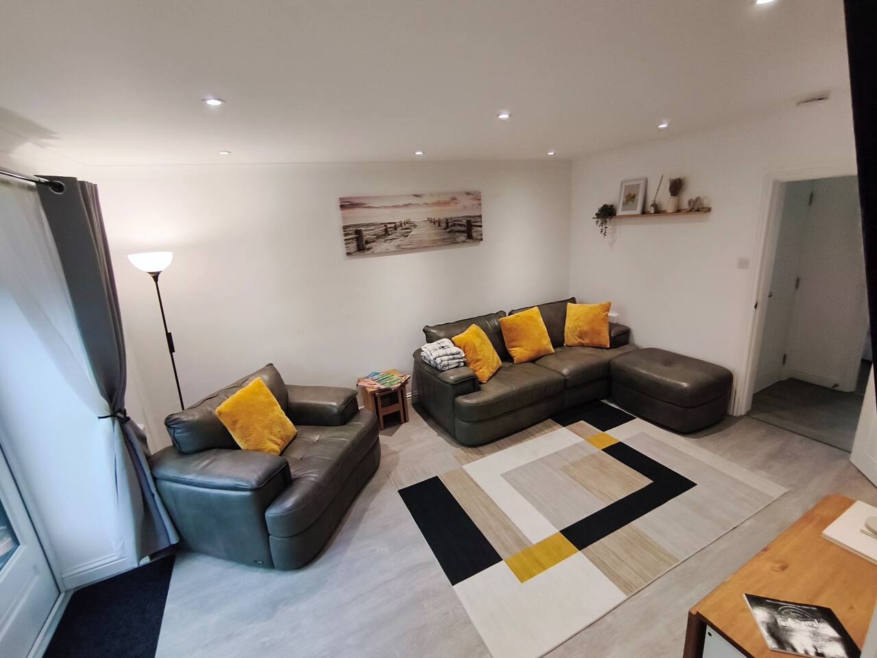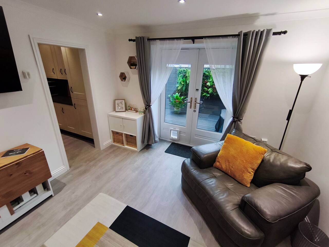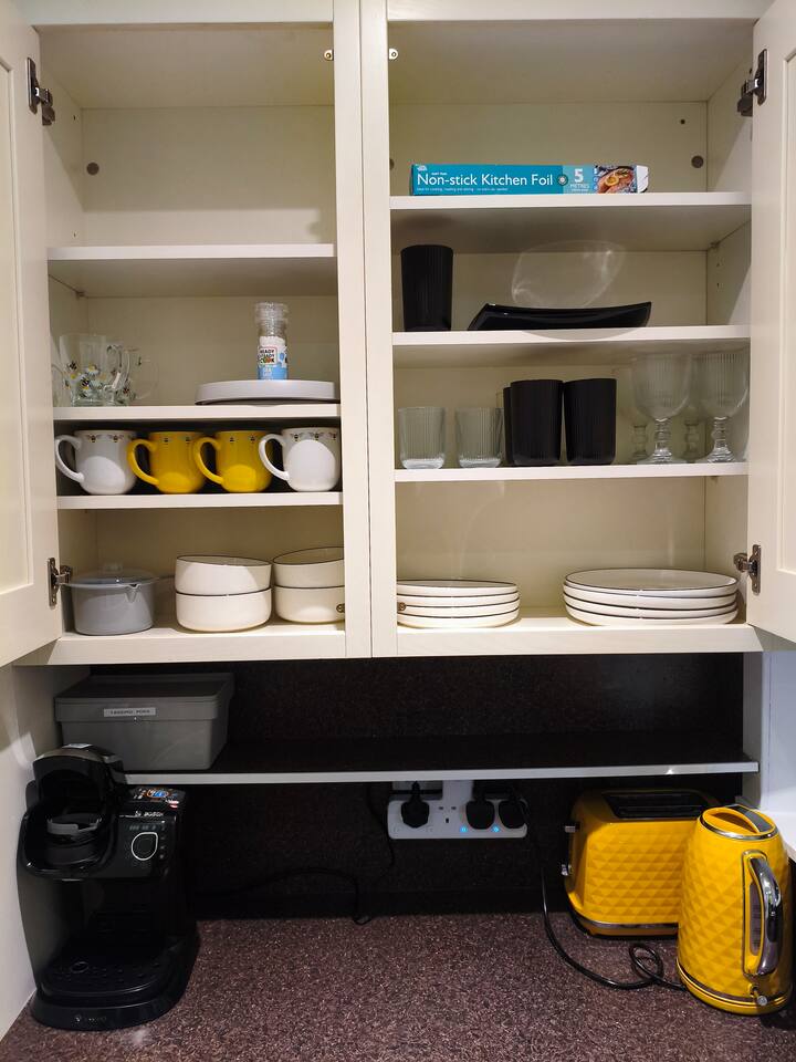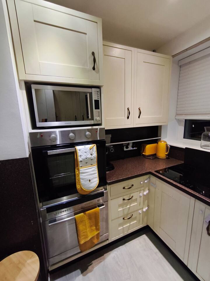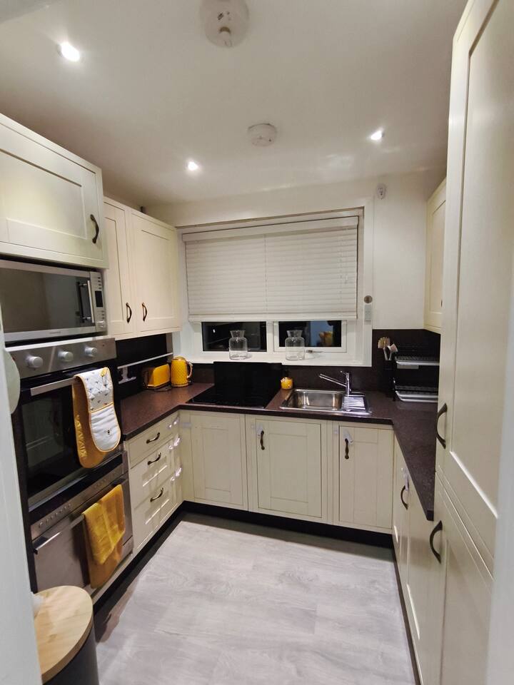 Bedroom 1 - King size bed, 2 wardrobes with drawers, bedside shelf, and plenty of over bed storage. Night lights above bed. Large travel cot (Sleep N Play Centre) with change shelf, mid height infant position and zipper door to make a secure play area. Blackout roller blinds (full blackout achieved with stick on portable blind) Roku 40" wall mounted TV Bedroom 2 - Double bed, wardrobe with drawers, bedside table, dressing table with illuminated mirror. Blackout roller blinds (full blackout achieved with stick on portable blind) Roku 40" wall mounted TV Kitchen - Single electric oven, microwave, dishwasher, Tassimo coffee machine, kettle, toaster, dual drawer air fryer, induction 4 plate hob, full size fridge and freezer. CHILD SAFETY CATCHES ON ALL LOW LEVEL DRAWERS AND CUPBOARDS Lounge - Large comfy sofa, reading light, drop leaf table with stowaway chairs x 4, 65" Roku TV. Net curtains and blackout curtains cover the French doors which lead you to the private back garden. Back Garden - Private and secure decked area with gated exits. There are seat cushions, rugs and lights inside the garden storage box. Please note this is a private area for use only by guests, however, the neighbour upstairs does have access rights to get to their back garden. The grassed area beyond gate to the rear is communial and you are welcome to enjoy that as well. Bathroom - Full bathroom with large basin, P shaped shower bath and dual head rainfall shower. Cole & Lewis shampoo, conditioner and body wash. Front Garden & Driveway - Sensor light over front door and security light/camera over garage to cover the driveway area. Whole area is secured with low level metal fencing and gates. Lockblock driveway with plenty of space for 3 cars.