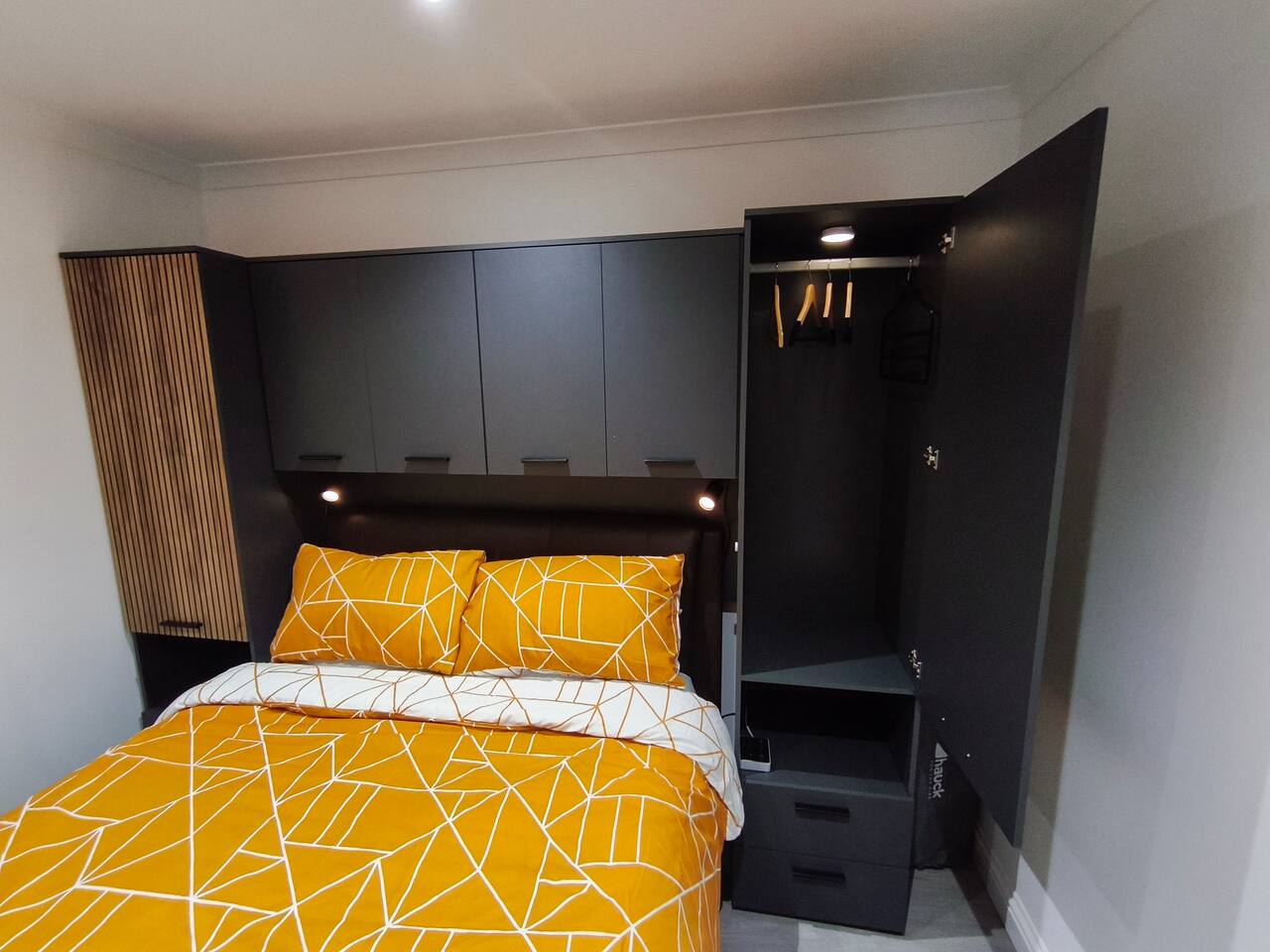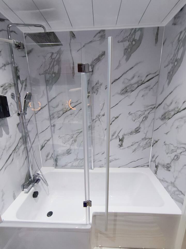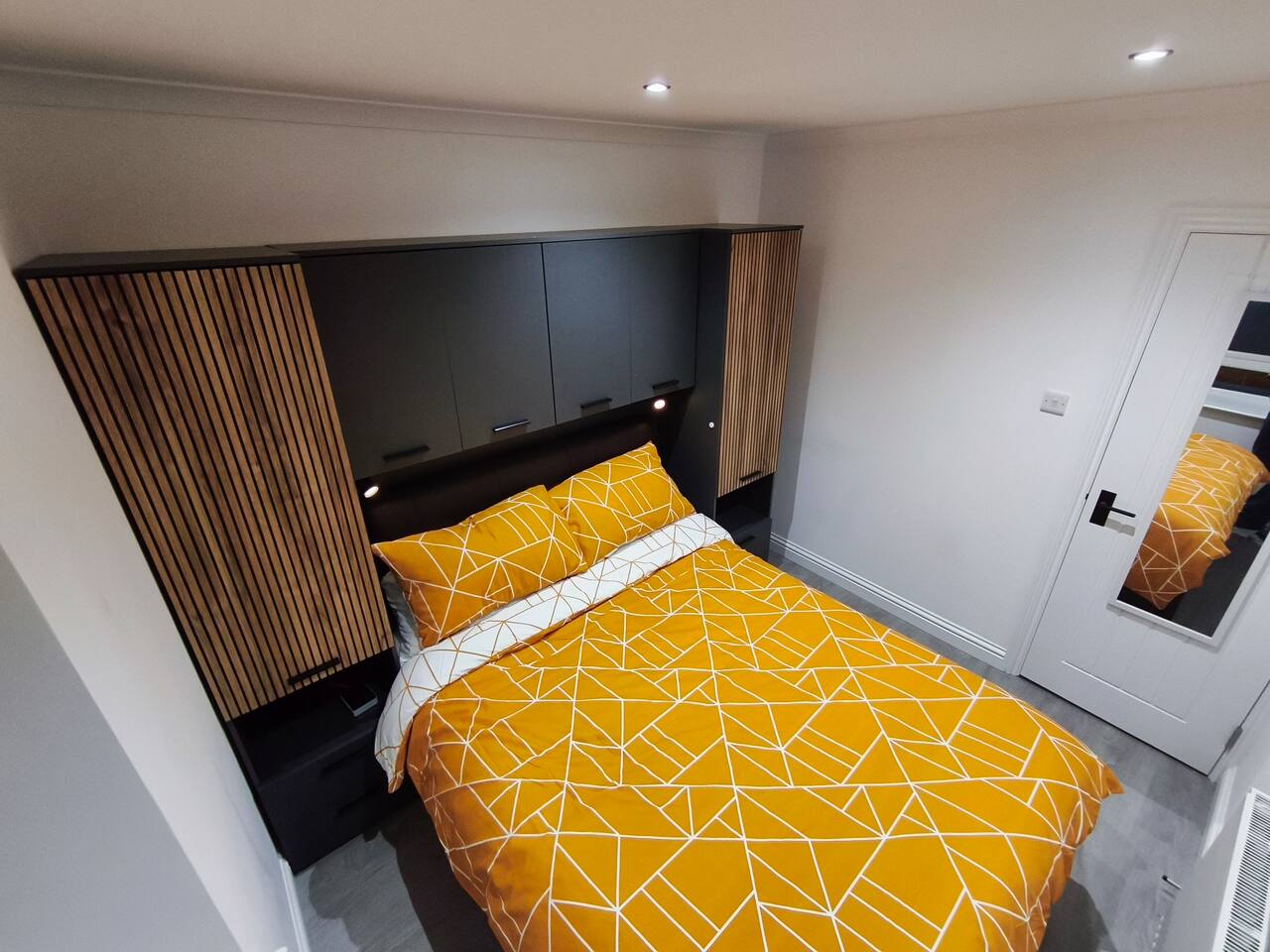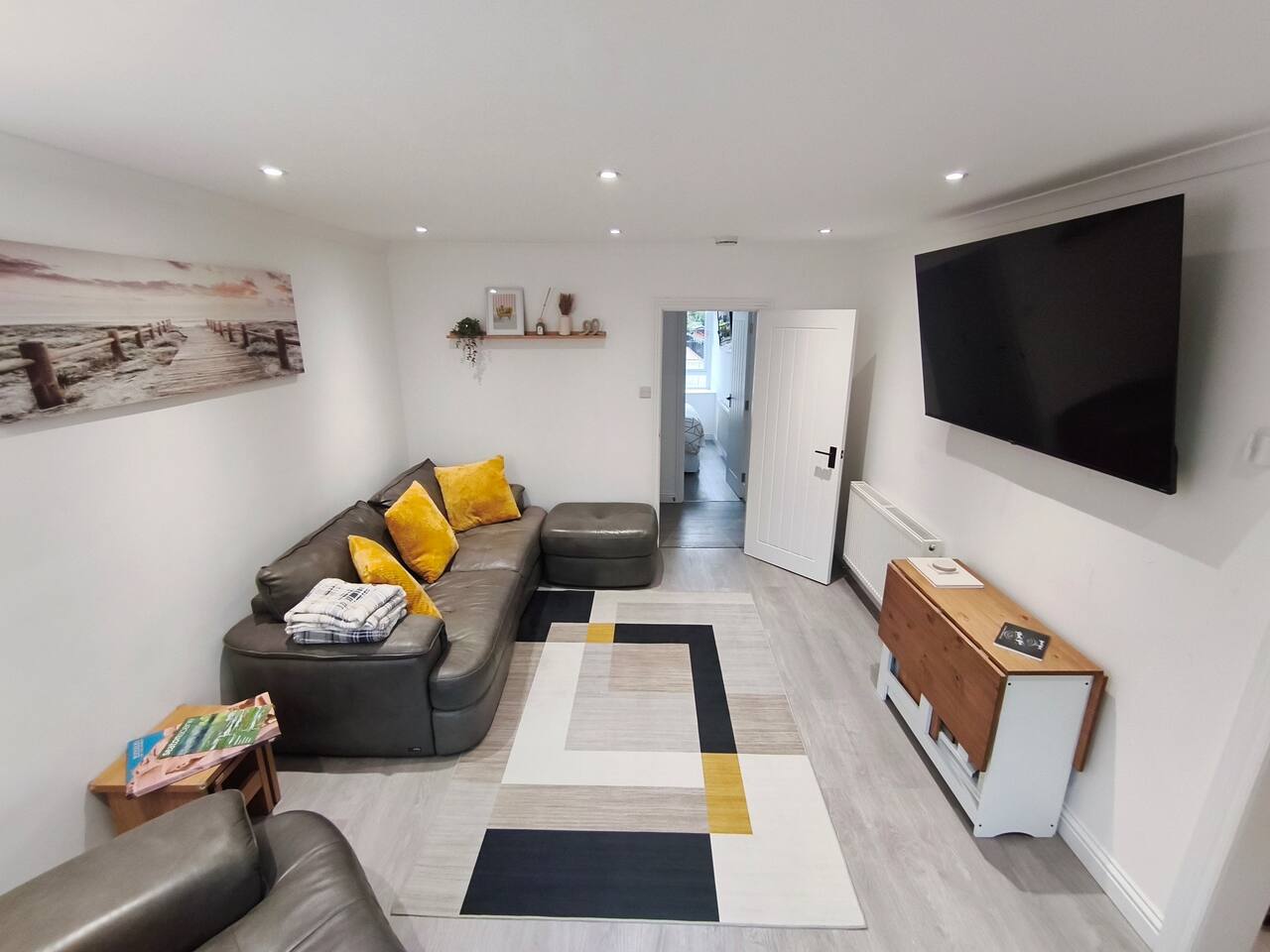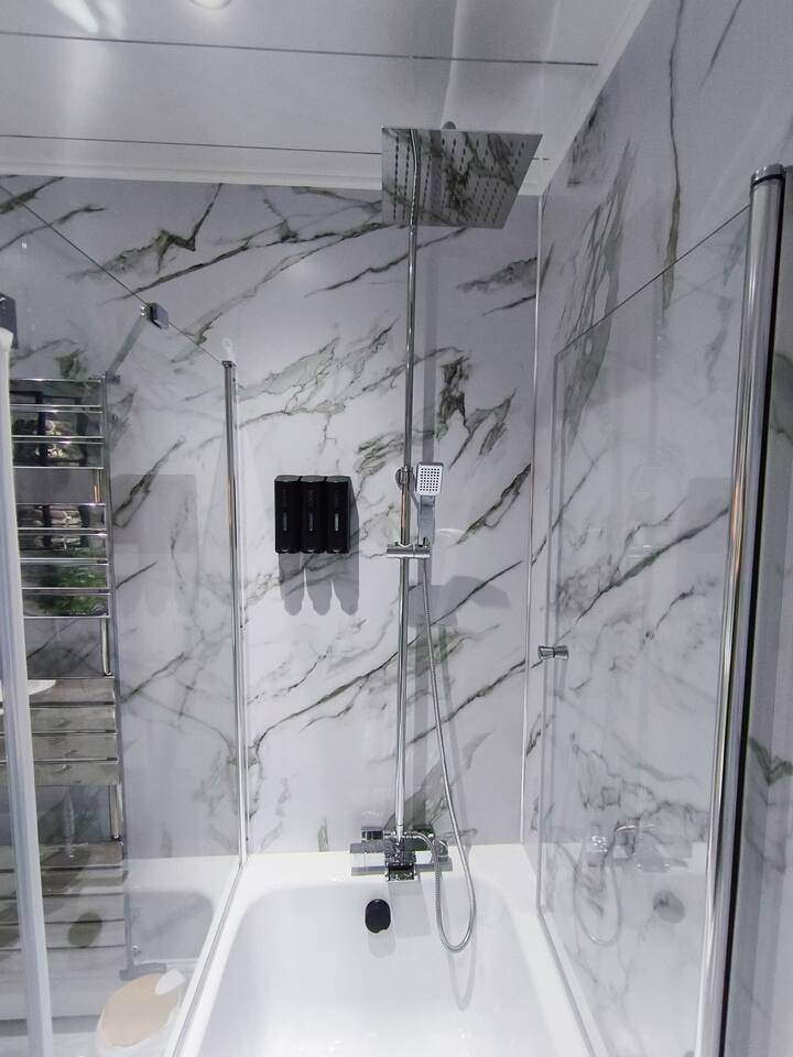 Bedroom 1 - King size bed, 2 wardrobes with drawers, bedside shelf, and plenty of over bed storage. Night lights above bed. Large travel cot (Sleep N Play Centre) with change shelf, mid height infant position and zipper door to make a secure play area. Blackout roller blinds (full blackout achieved with stick on portable blind) Roku 40" wall mounted TV Bedroom 2 - Double bed, wardrobe with drawers, bedside table, dressing table with illuminated mirror. Blackout roller blinds (full blackout achieved with stick on portable blind) Roku 40" wall mounted TV Kitchen - Single electric oven, microwave, dishwasher, Tassimo coffee machine, kettle, toaster, dual drawer air fryer, induction 4 plate hob, full size fridge and freezer. CHILD SAFETY CATCHES ON ALL LOW LEVEL DRAWERS AND CUPBOARDS Lounge - Large comfy sofa, reading light, drop leaf table with stowaway chairs x 4, 65" Roku TV. Net curtains and blackout curtains cover the French doors which lead you to the private back garden. Back Garden - Private and secure decked area with gated exits. There are seat cushions, rugs and lights inside the garden storage box. Please note this is a private area for use only by guests, however, the neighbour upstairs does have access rights to get to their back garden. The grassed area beyond gate to the rear is communial and you are welcome to enjoy that as well. Bathroom - Full bathroom with large basin, P shaped shower bath and dual head rainfall shower. Cole & Lewis shampoo, conditioner and body wash. Front Garden & Driveway - Sensor light over front door and security light/camera over garage to cover the driveway area. Whole area is secured with low level metal fencing and gates. Lockblock driveway with plenty of space for 3 cars.