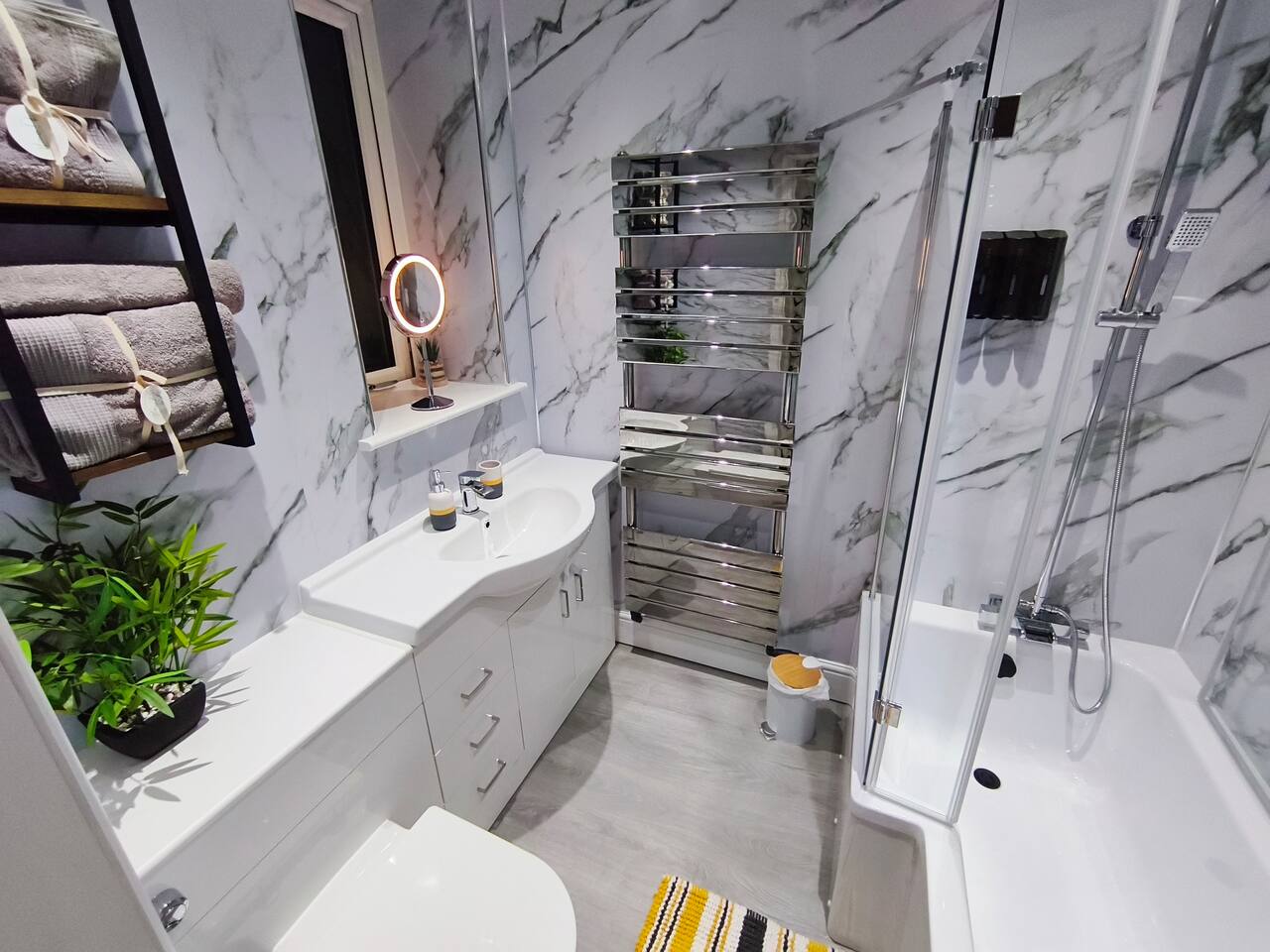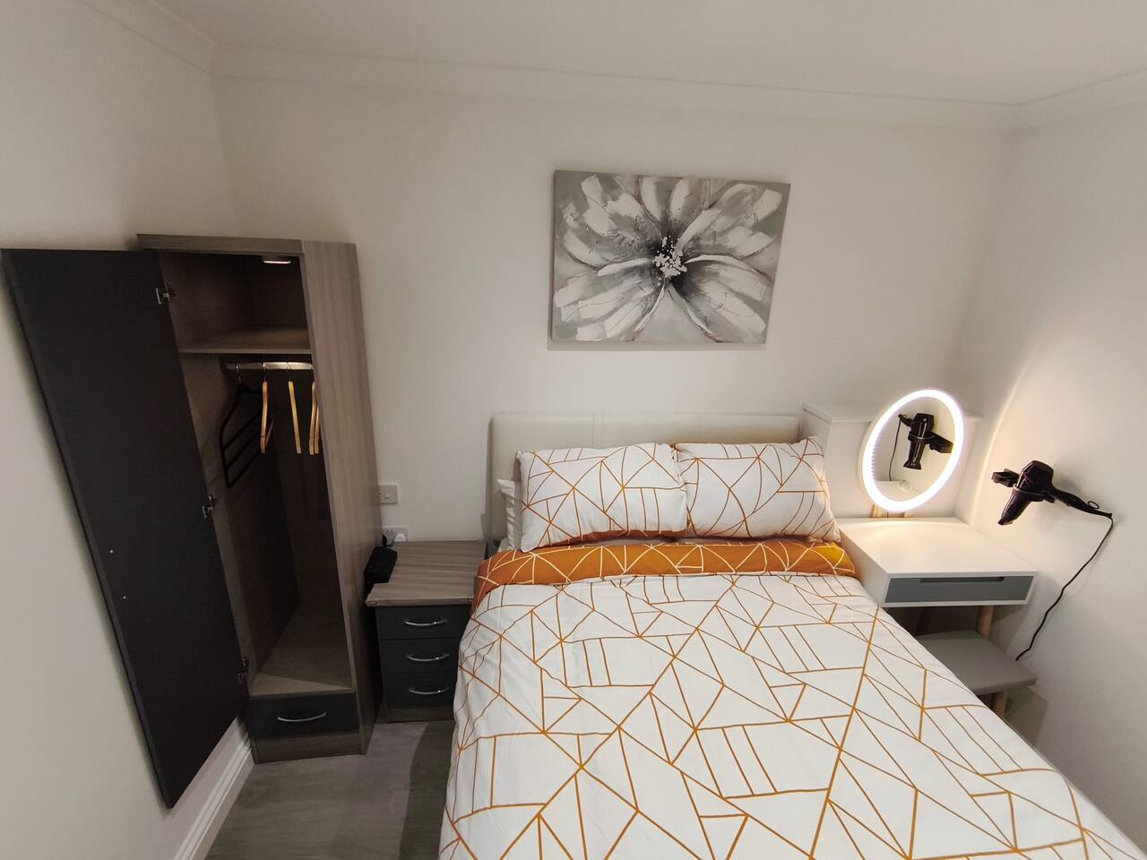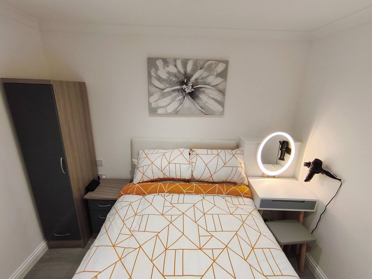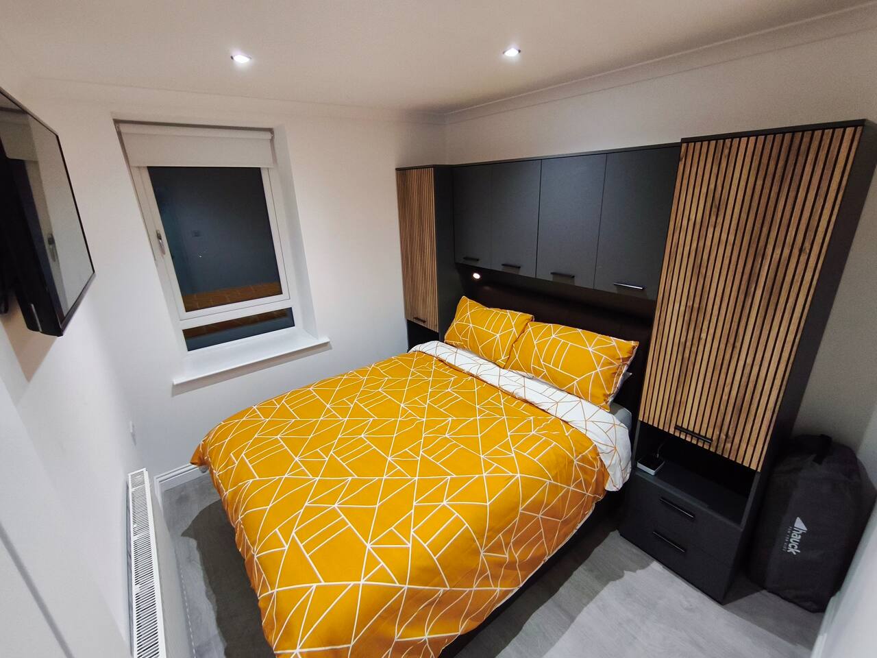 Bedroom 1 - King size bed, 2 wardrobes with drawers, bedside shelf, and plenty of over bed storage. Night lights above bed. Large travel cot (Sleep N Play Centre) with change shelf, mid height infant position and zipper door to make a secure play area. Blackout roller blinds (full blackout achieved with stick on portable blind) Roku 40" wall mounted TV Bedroom 2 - Double bed, wardrobe with drawers, bedside table, dressing table with illuminated mirror. Blackout roller blinds (full blackout achieved with stick on portable blind) Roku 40" wall mounted TV Kitchen - Single electric oven, microwave, dishwasher, Tassimo coffee machine, kettle, toaster, dual drawer air fryer, induction 4 plate hob, full size fridge and freezer. CHILD SAFETY CATCHES ON ALL LOW LEVEL DRAWERS AND CUPBOARDS Lounge - Large comfy sofa, reading light, drop leaf table with stowaway chairs x 4, 65" Roku TV. Net curtains and blackout curtains cover the French doors which lead you to the private back garden. Back Garden - Private and secure decked area with gated exits. There are seat cushions, rugs and lights inside the garden storage box. Please note this is a private area for use only by guests, however, the neighbour upstairs does have access rights to get to their back garden. The grassed area beyond gate to the rear is communial and you are welcome to enjoy that as well. Bathroom - Full bathroom with large basin, P shaped shower bath and dual head rainfall shower. Cole & Lewis shampoo, conditioner and body wash. Front Garden & Driveway - Sensor light over front door and security light/camera over garage to cover the driveway area. Whole area is secured with low level metal fencing and gates. Lockblock driveway with plenty of space for 3 cars.